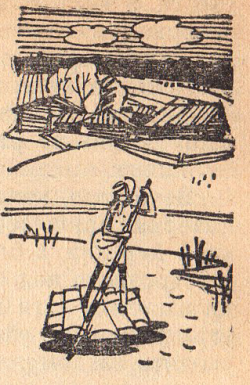 Танька сначала перевозит женщину, которая боязливо сидит на корточках посередке полузатонувшего плота, а потом мужчину — он отнимает у Таньки березовый багор и сильно гонит плот, покрикивая с одышкой: