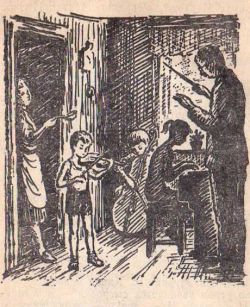 Играть приходится долго, каждая вещь исполняется два-три раза. После каждой пьески — восторженные возгласы, аплодисменты. Время идет. Чувствуется, что гости утомились и не прочь бы засесть за стол, поближе к водке и пирогу. А отец знай подкладывает на пульты все новые и новые ноты. Отец сияет, то и дело оборачивается к гостям, поясняет скороговоркой: